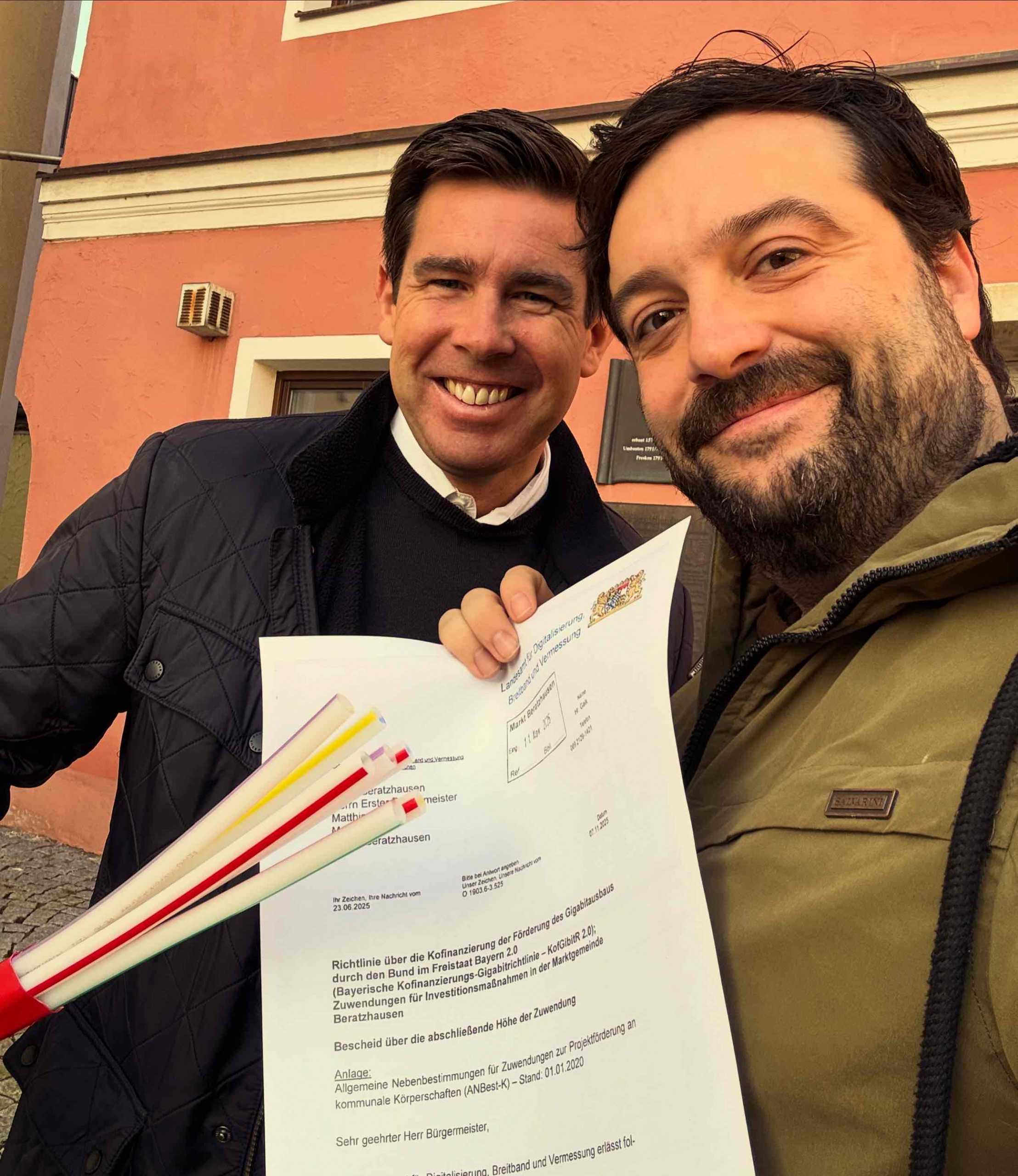 Letzte Woche überbrachte Patrick Großmann (MdL) dem Markt Beratzhausen persönlich den Förderbescheid des Freistaats Bayern für den Glasfaserausbau. Unsere Gemeinde erhält eine Zuwendung in Höhe von 2,76 Millionen Euro. Damit wird die bestehende Finanzierungslücke im Projekt „Weiße Flecken“ geschlossen.