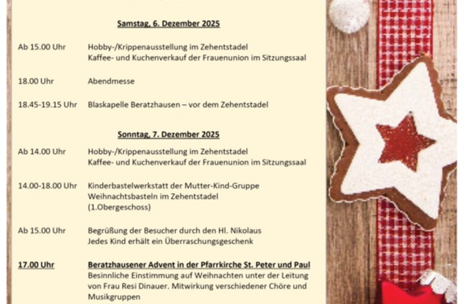 Beratzhausener Weihnachtsmarkt mit Hobbyausstellung am Samstag, den 6. Dezember 2025 und Sonntag, den 7. Dezember 2025 Verschiedene Aussteller zeigen ihre Hobby-Arbeiten in allen