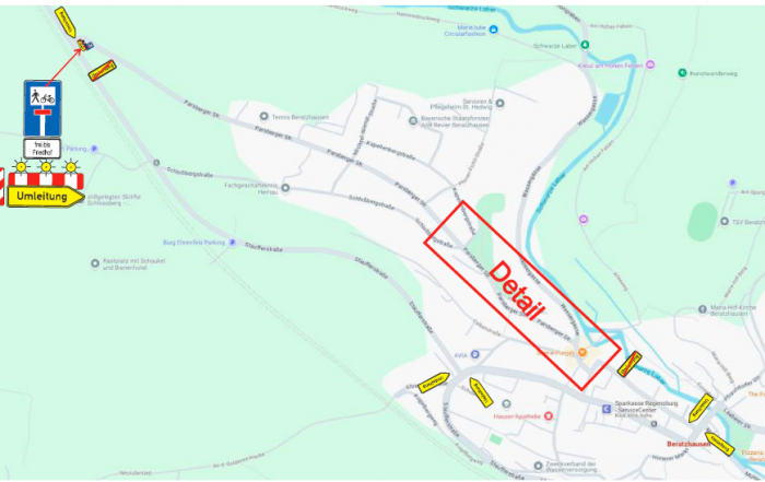 Volllsperrung Parsberger Straße Aufgrund der anhaltenden Bauarbeiten in der Parsberger Straße muss die Vollsperrung für den Zeitraum vom 06.05.2025 bis 26.05.2025 verlängert werden.